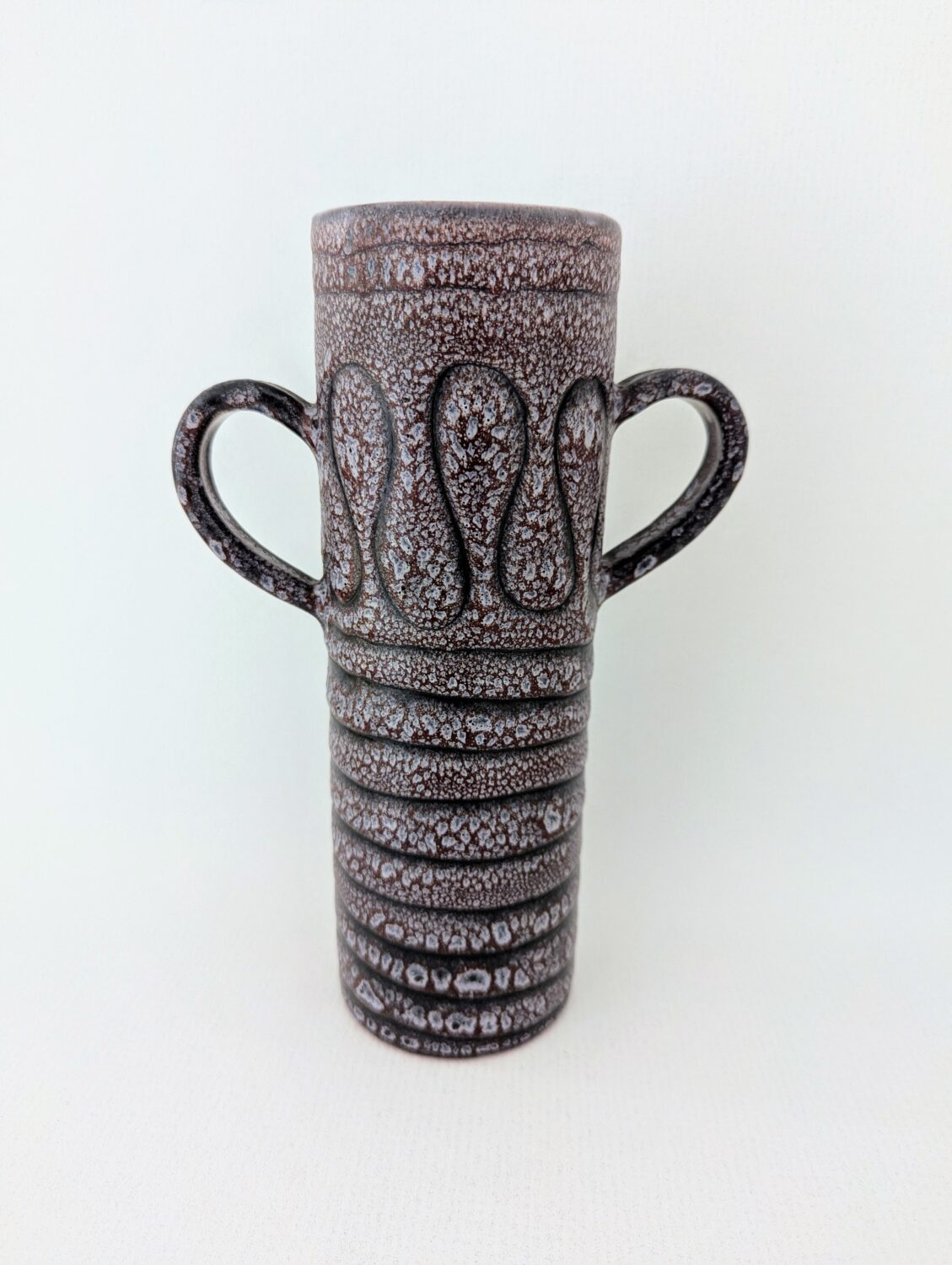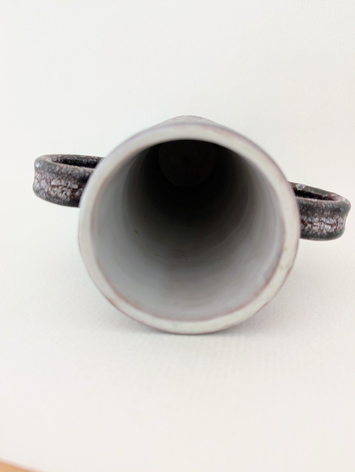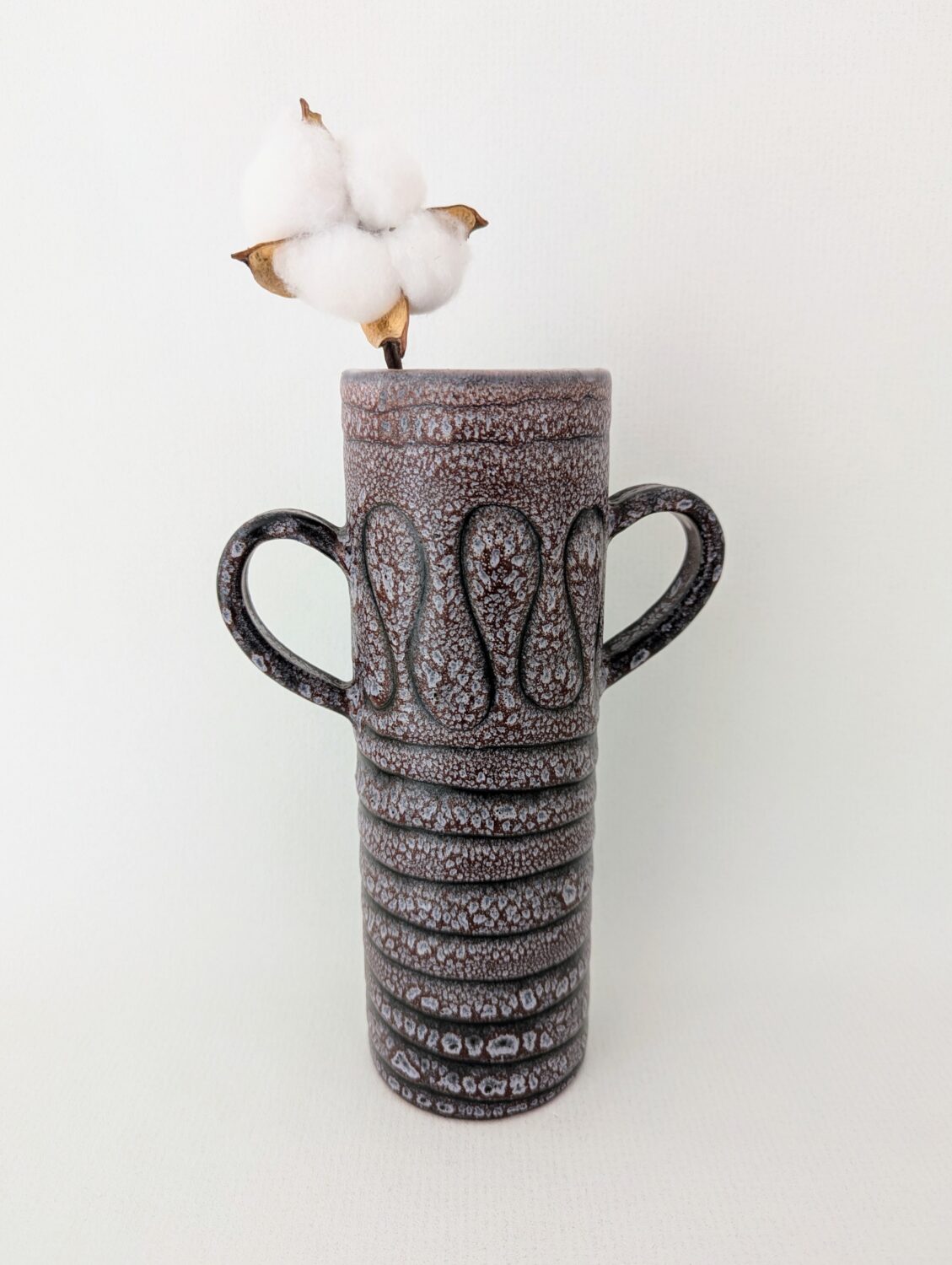D’abord, ce vase en grès émaillé signé Jean Austruy incarne parfaitement l’esprit de la céramique d’atelier française des années 60. Ensuite, sa forme haute et tubulaire attire immédiatement le regard. Aussi, ses deux anses symétriques renforcent son équilibre visuel. De plus, son émaillage texturé moucheté, décliné dans des nuances subtiles de brun, d’aubergine et de gris, souligne un travail de matière sobre et profondément expressif.