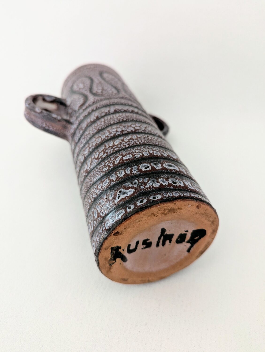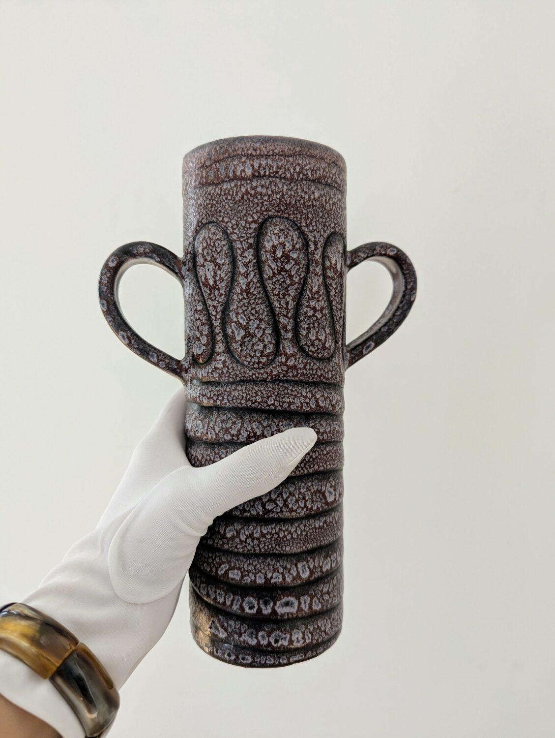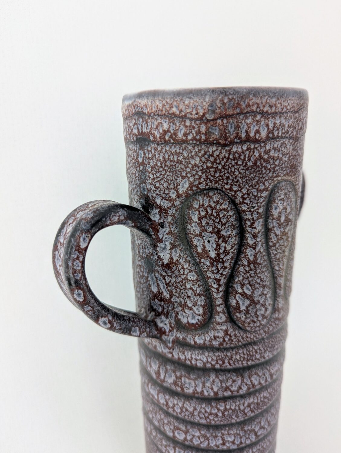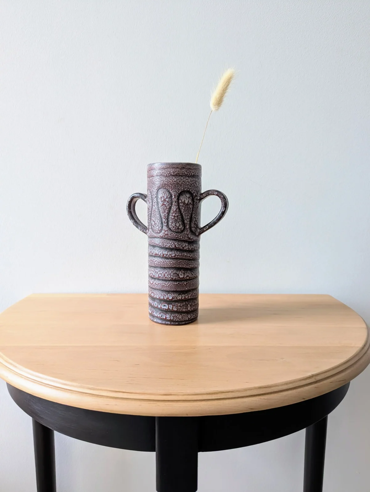 D’abord, ce vase en grès émaillé signé Jean Austruy incarne parfaitement l’esprit de la céramique d’atelier française des années 60. Ensuite, sa forme haute et tubulaire attire immédiatement le regard. Aussi, ses deux anses symétriques renforcent son équilibre visuel. De plus, son émaillage texturé moucheté, décliné dans des nuances subtiles de brun, d’aubergine et de gris, souligne un travail de matière sobre et profondément expressif.