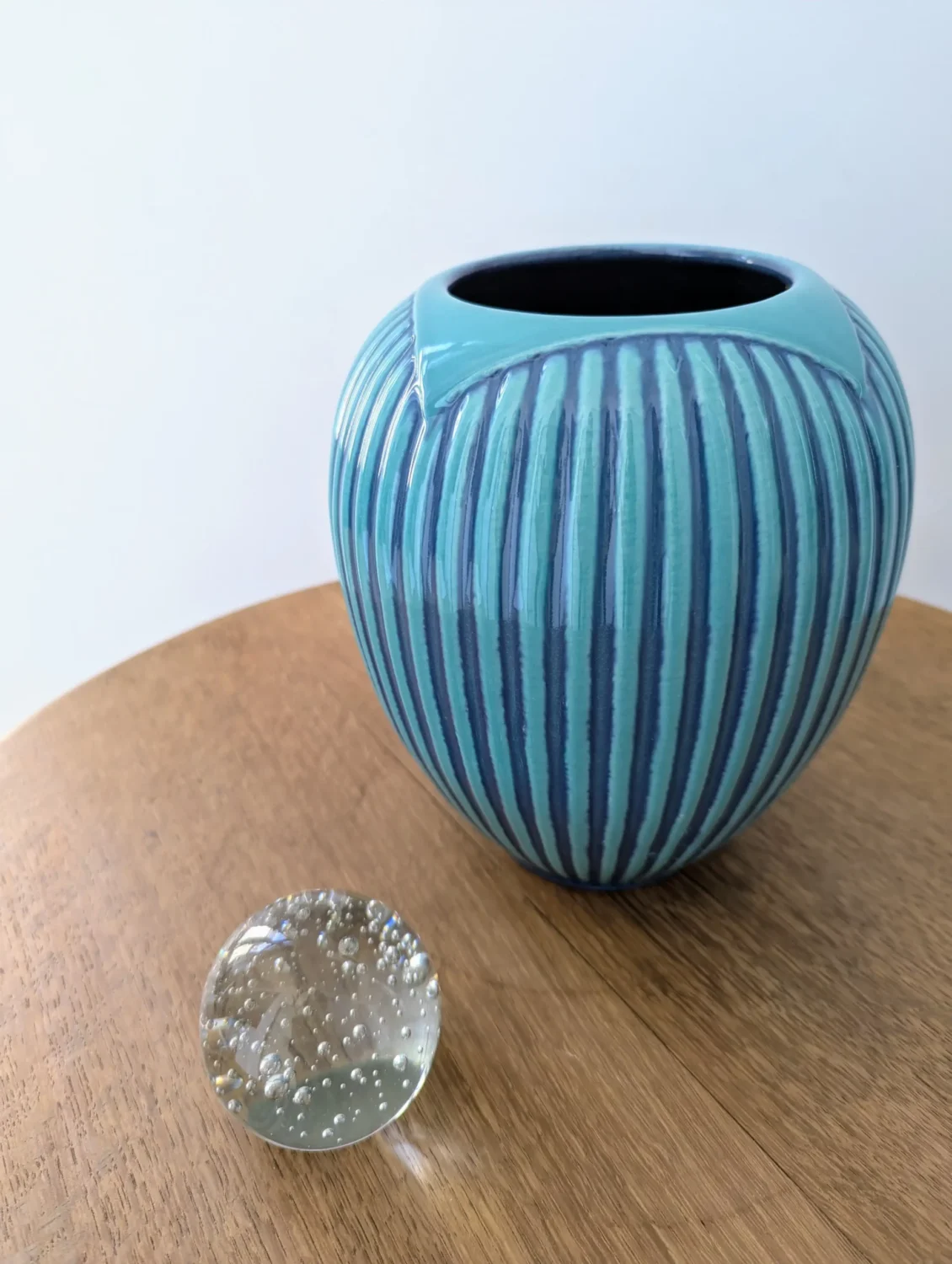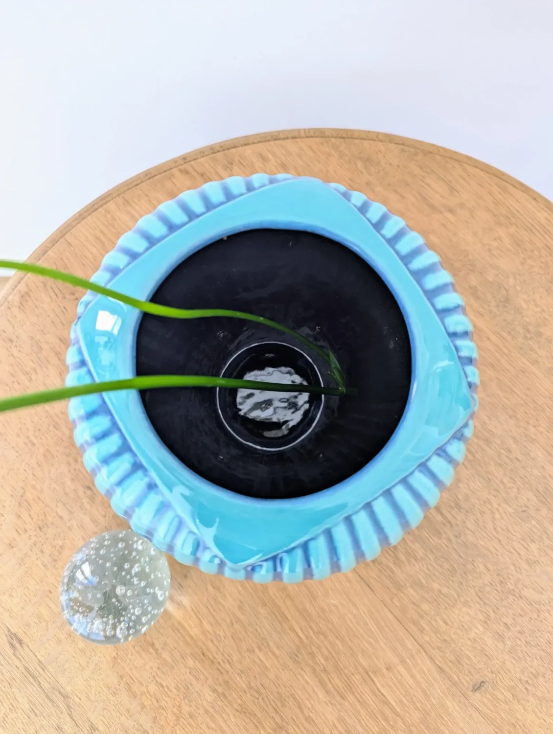 Ce qui distingue particulièrement ce vase, c’est sa palette de couleurs vibrantes et actuelles. Le bleu roi intense et le bleu turquoise, appliqués en couches successives sur la céramique émaillée, créent un contraste dynamique et lumineux. Ces teintes s’intègrent aussi bien dans une décoration contemporaine que dans un intérieur plus classique ou vintage.