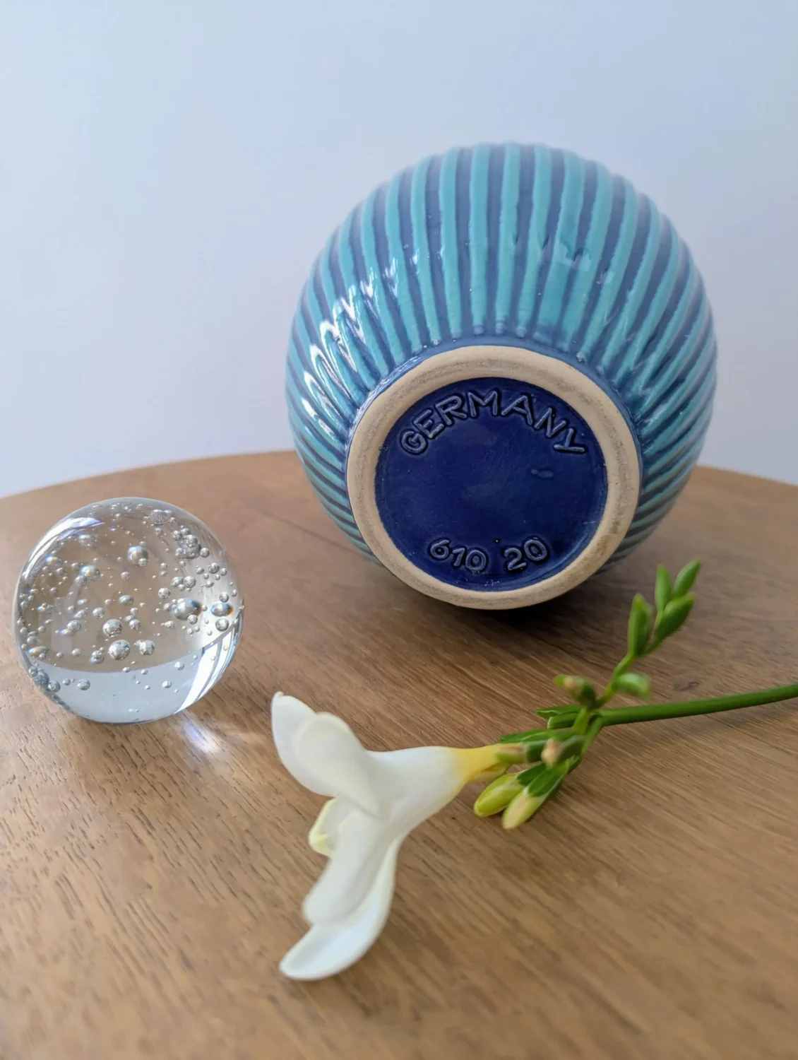 Ce vase est un produit original « W. Germany », portant la mention et le numéro de modèle gravés sous sa base. Il témoigne du savoir-faire céramique allemand, alliant technicité de l’émaillage et recherche esthétique. L’émail légèrement satiné lui donne un aspect brillant sans excès, et renforce l’impact des couleurs.