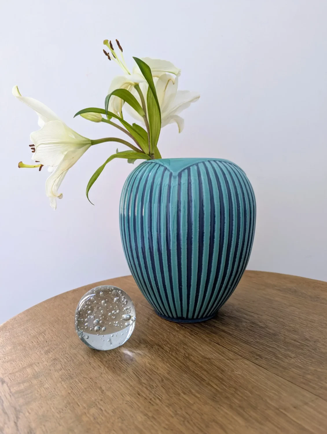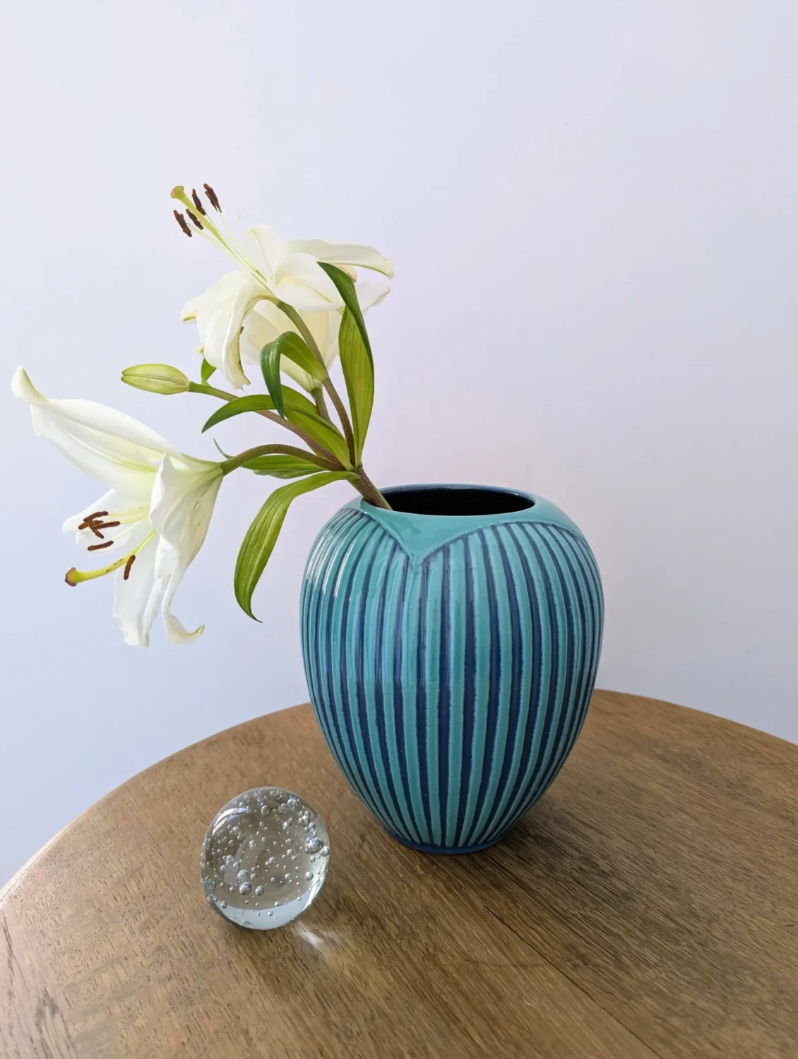 Chaque angle offre une lecture différente du vase : tantôt profond et intense, tantôt lumineux et frais selon l’éclairage naturel. C’est une pièce décorative polyvalente, qui attire le regard tout en restant élégante et sobre.