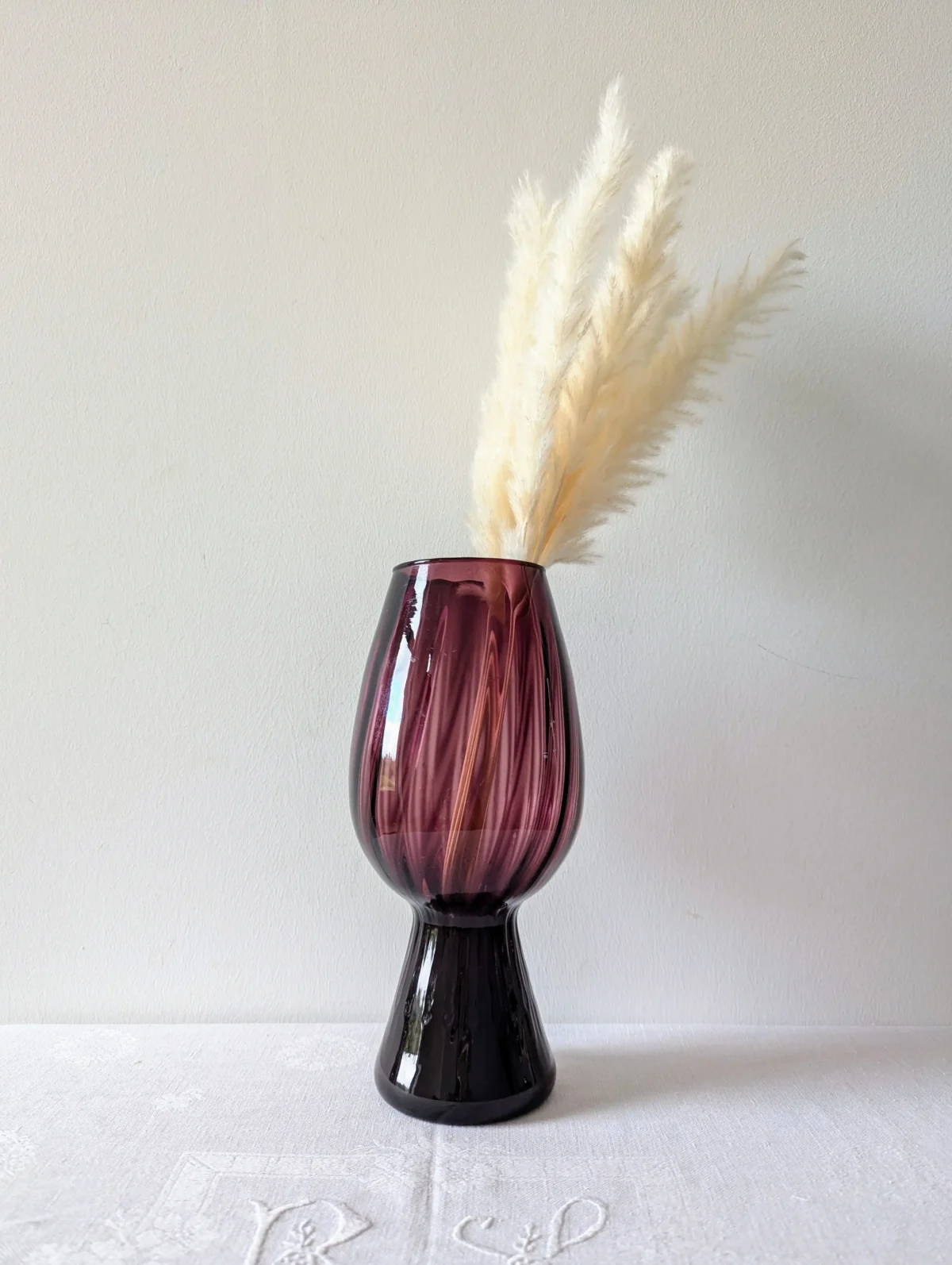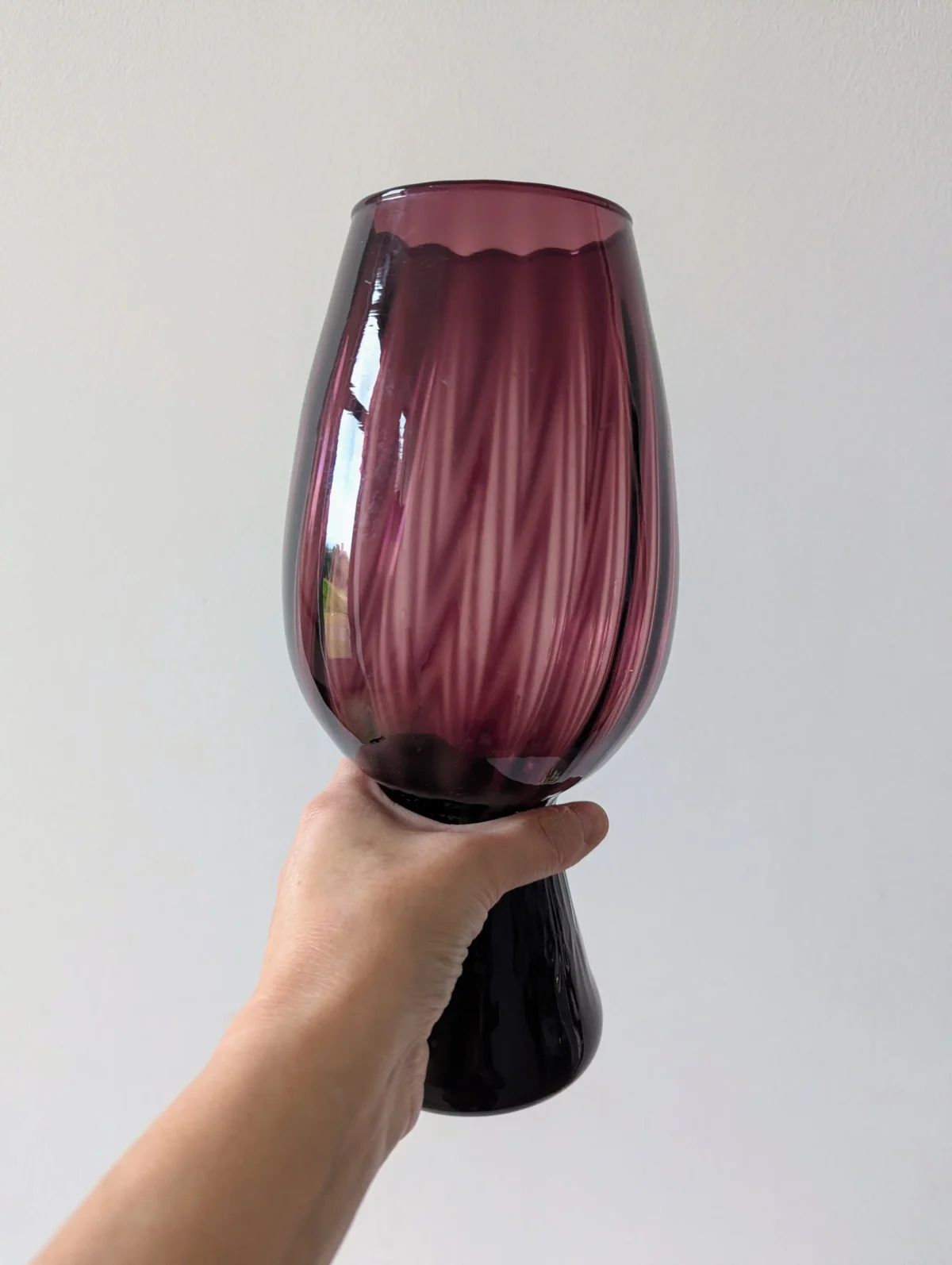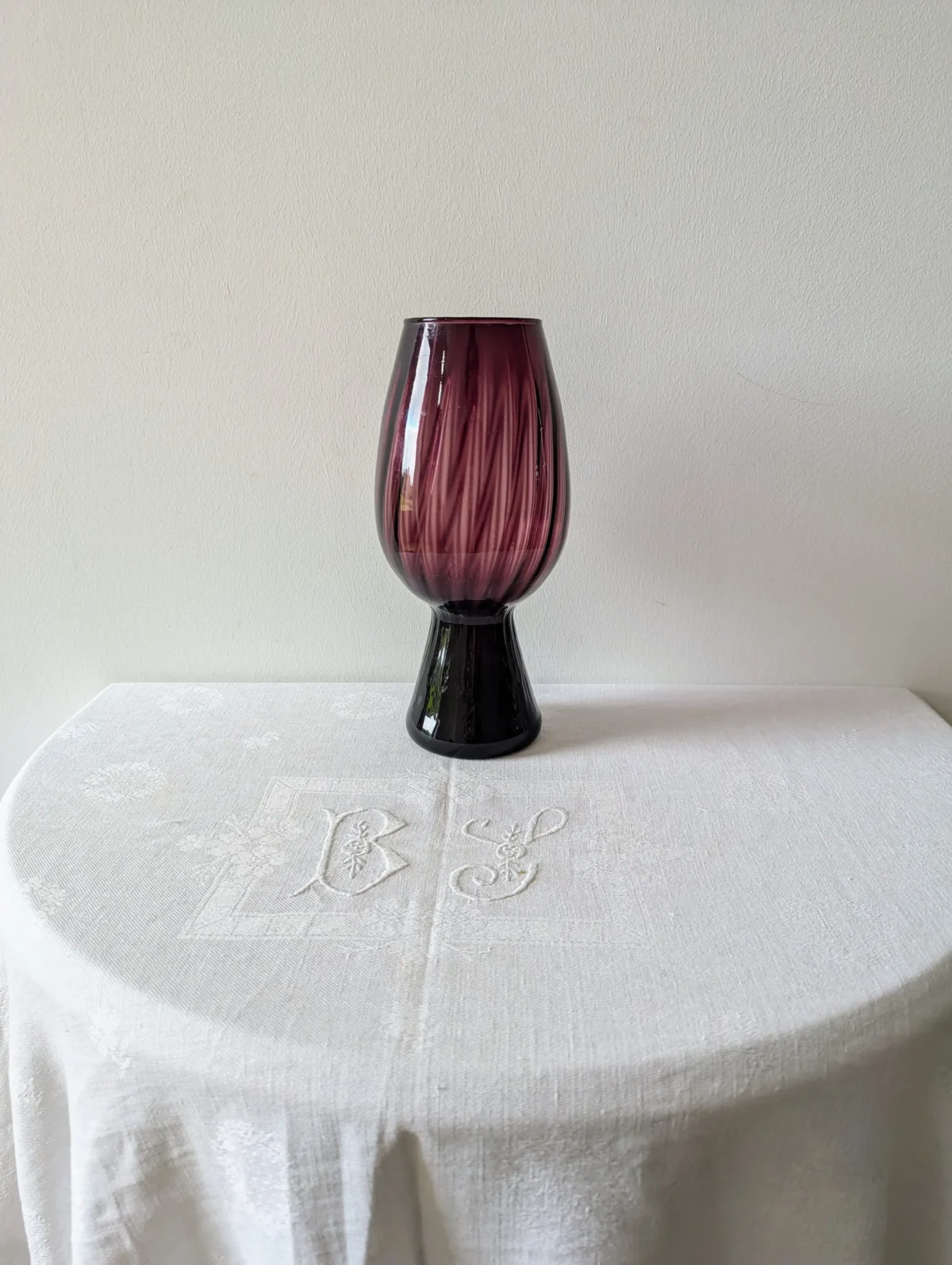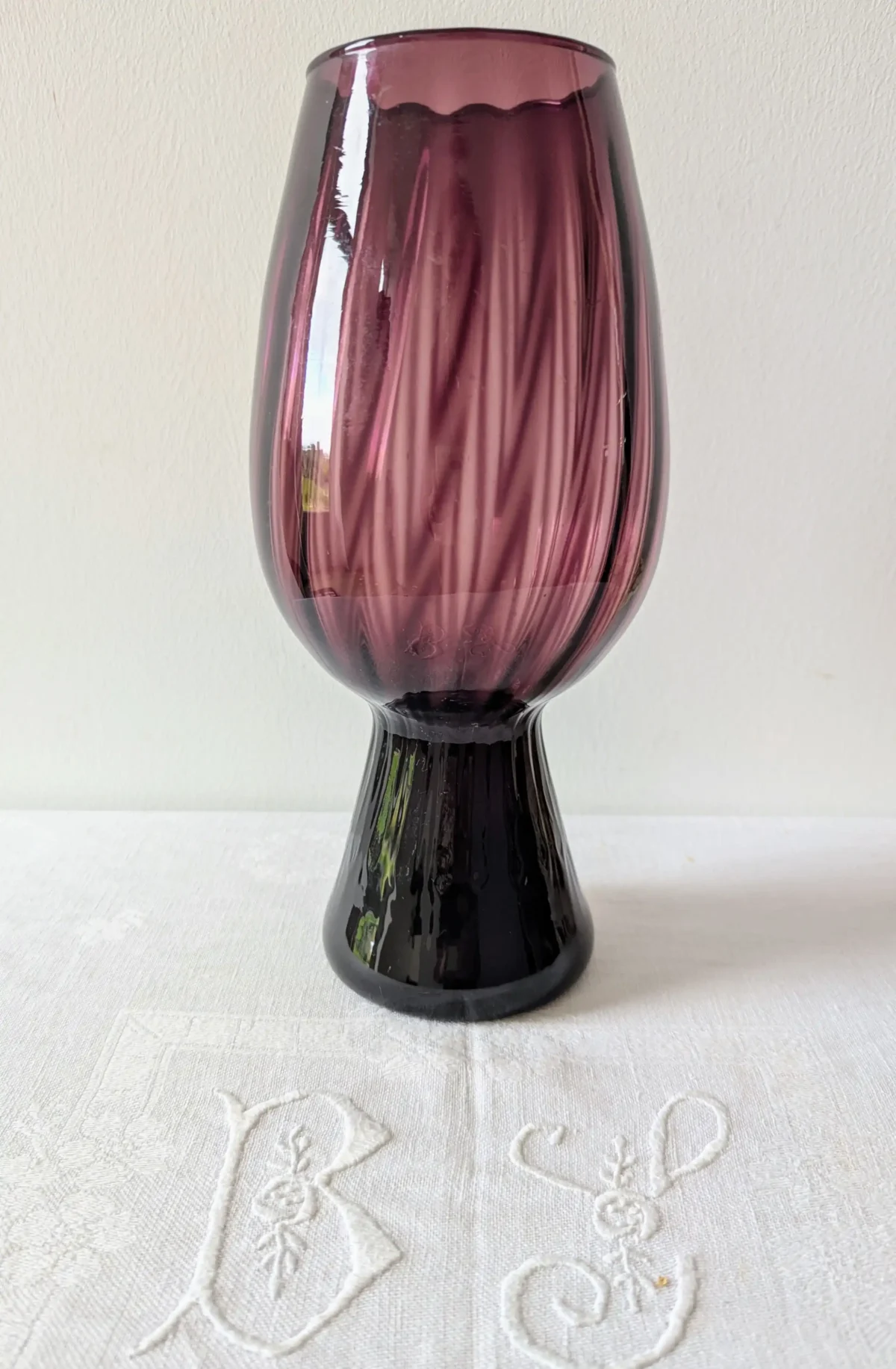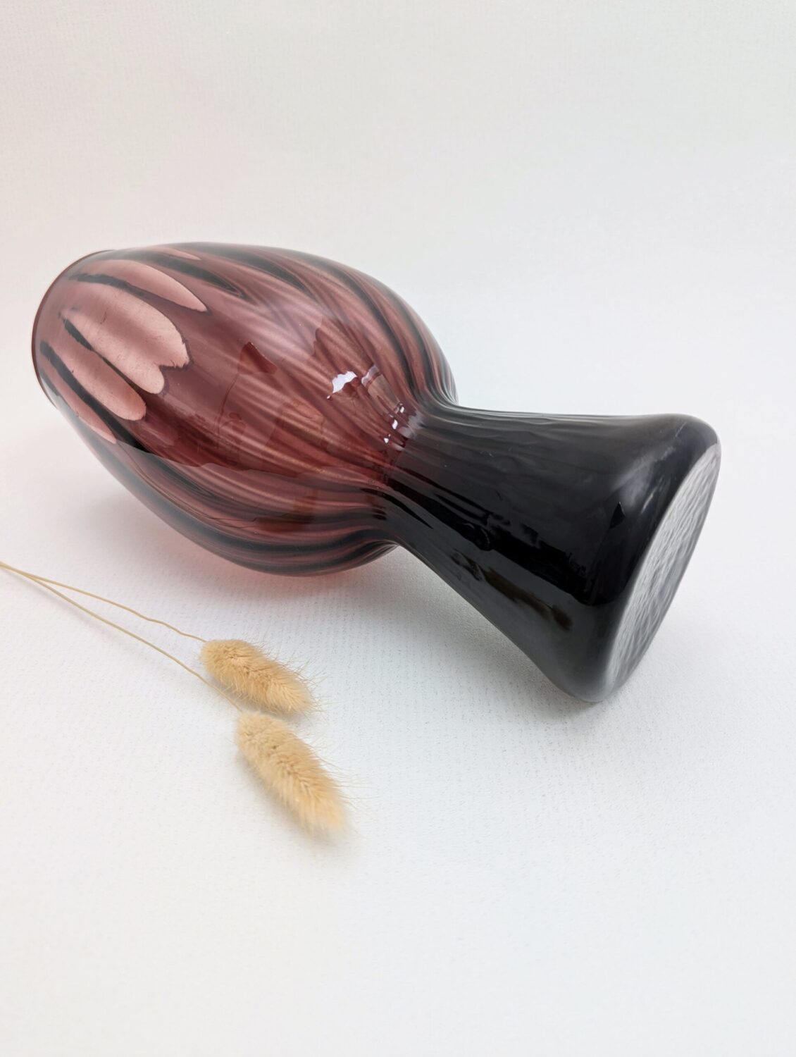 Ce vase se distingue par sa silhouette élancée, reposant sur un pied creux qui lui confère une stabilité idéale. Sa teinte violet parme, rehaussée de subtils motifs en spirale plus sombres, crée un jeu de lumière captivant, apportant profondeur et sophistication à votre décoration.