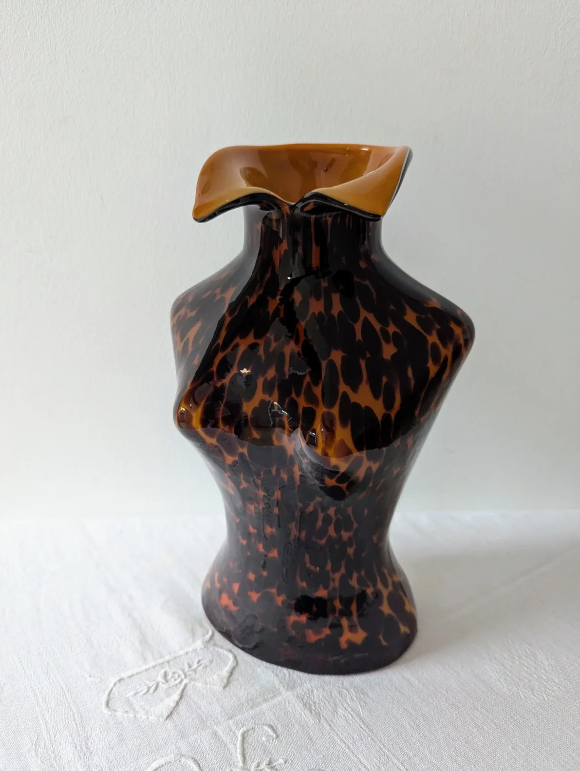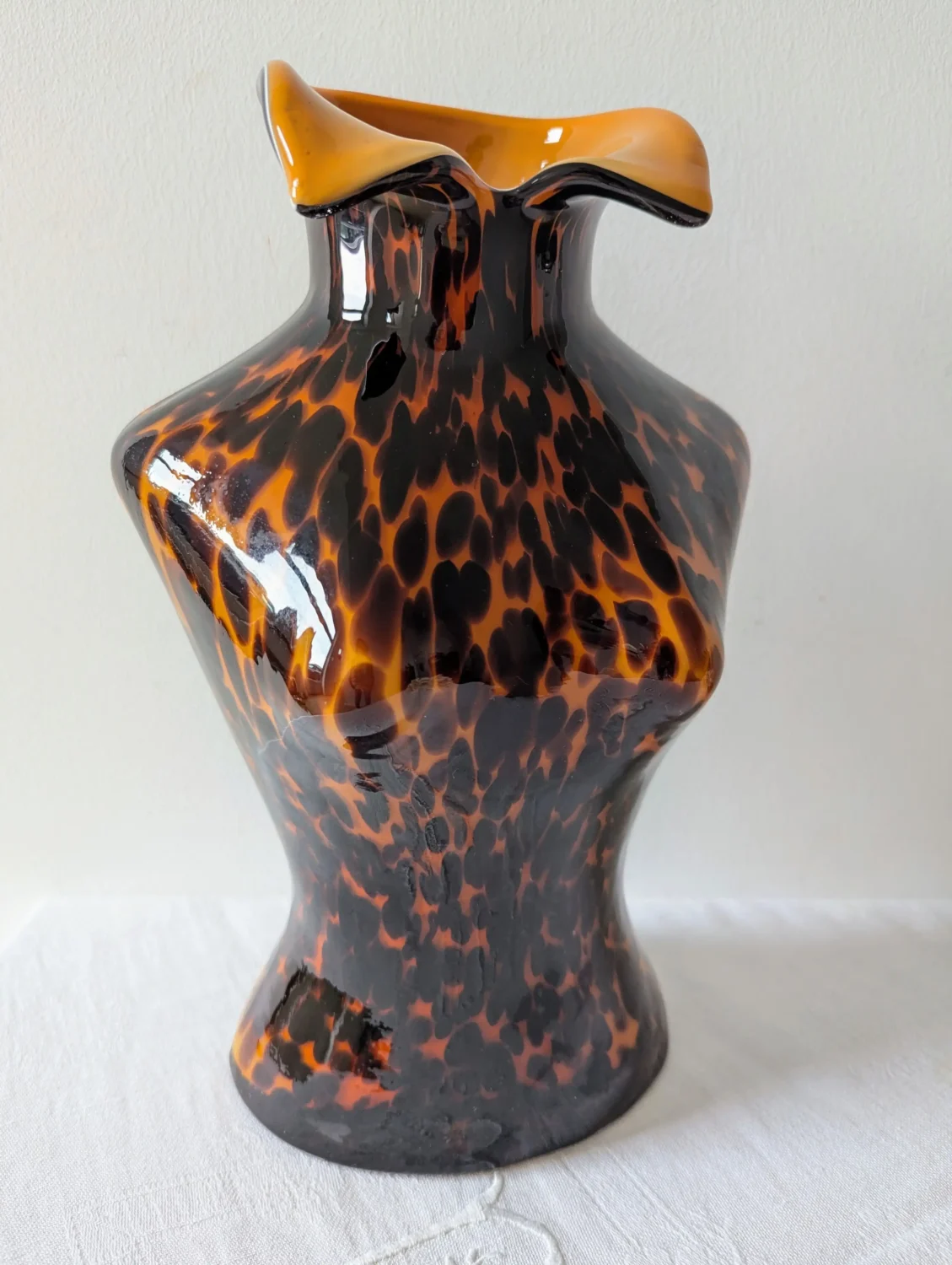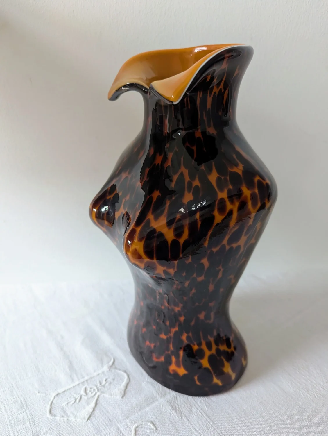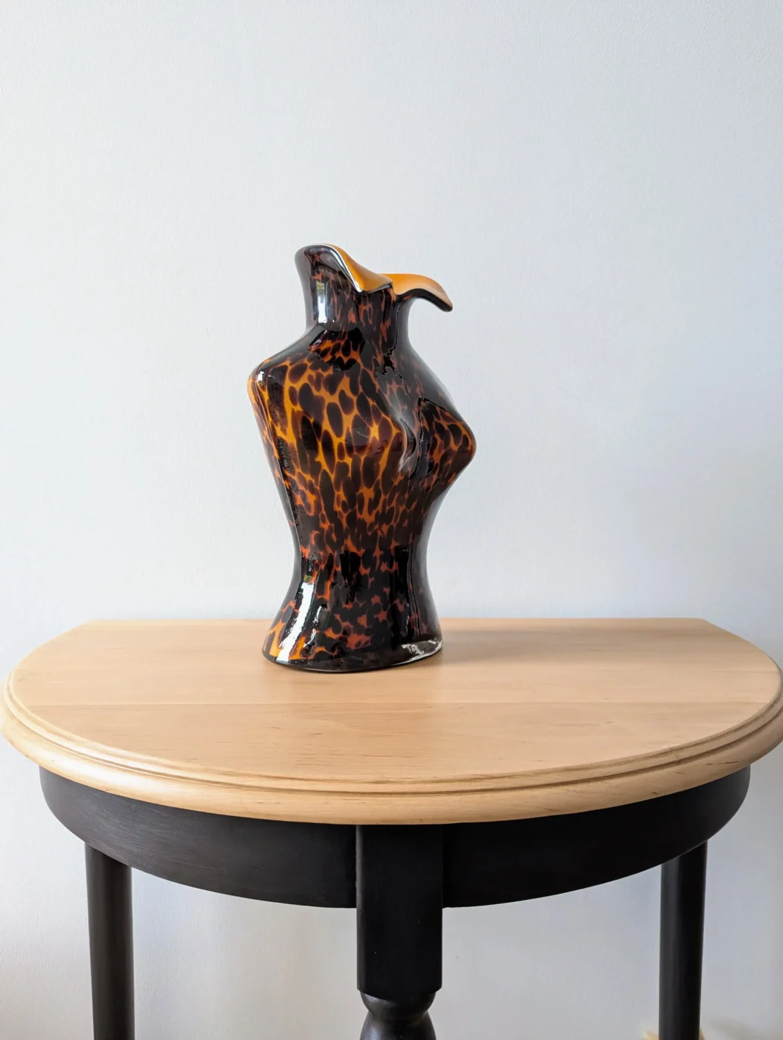 Ce vase sculptural style Murano attire le regard par sa silhouette organique et son motif léopard d’un brun profond mêlé d’éclats ambrés. Entièrement réalisé en verre moulé, il présente des lignes libres et sensuelles, évoquant un buste féminin stylisé. Sa texture brillante et son dégradé chaleureux en font une pièce déco forte, à la fois moderne et vintage.