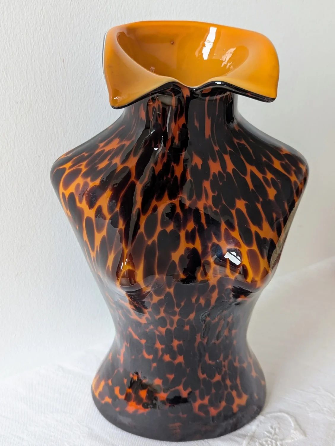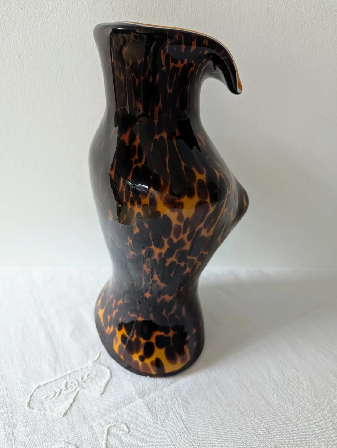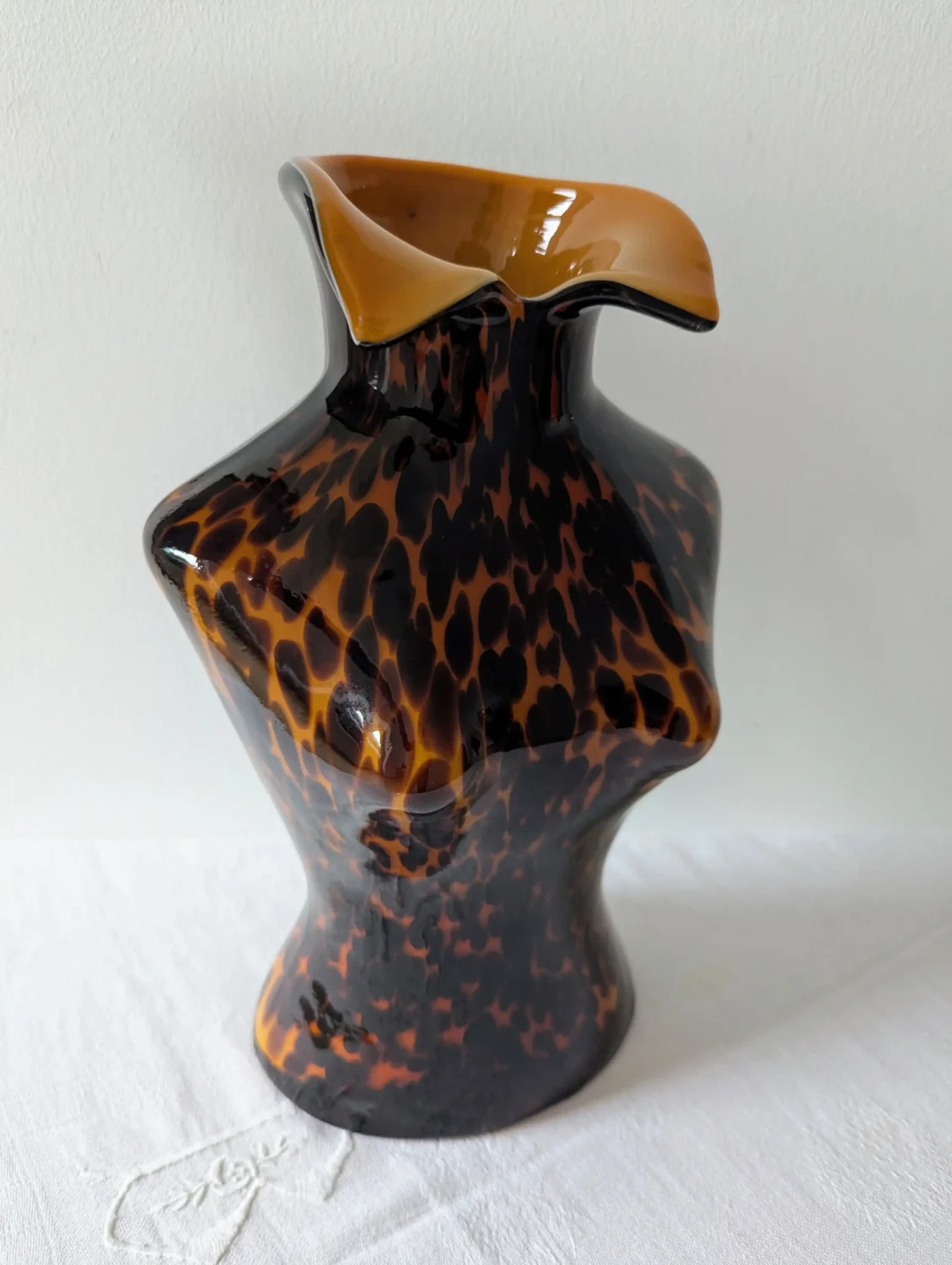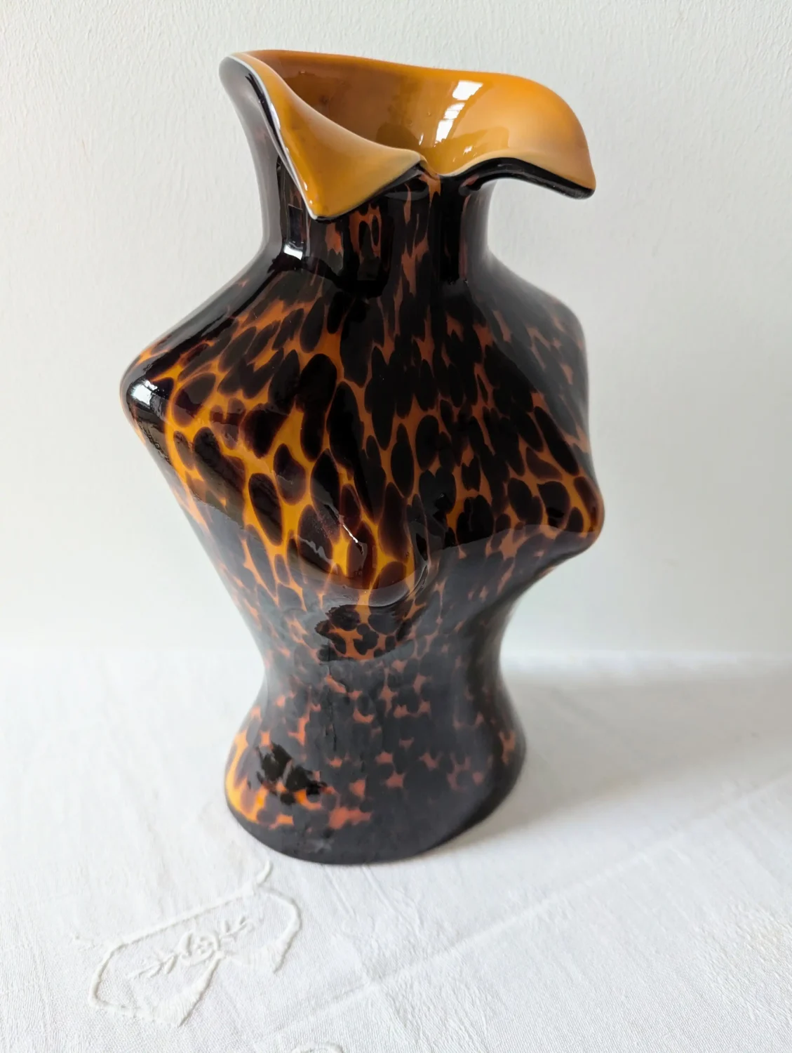 Ce vase sculptural style Murano attire le regard par sa silhouette organique et son motif léopard d’un brun profond mêlé d’éclats ambrés. Entièrement réalisé en verre moulé, il présente des lignes libres et sensuelles, évoquant un buste féminin stylisé. Sa texture brillante et son dégradé chaleureux en font une pièce déco forte, à la fois moderne et vintage.