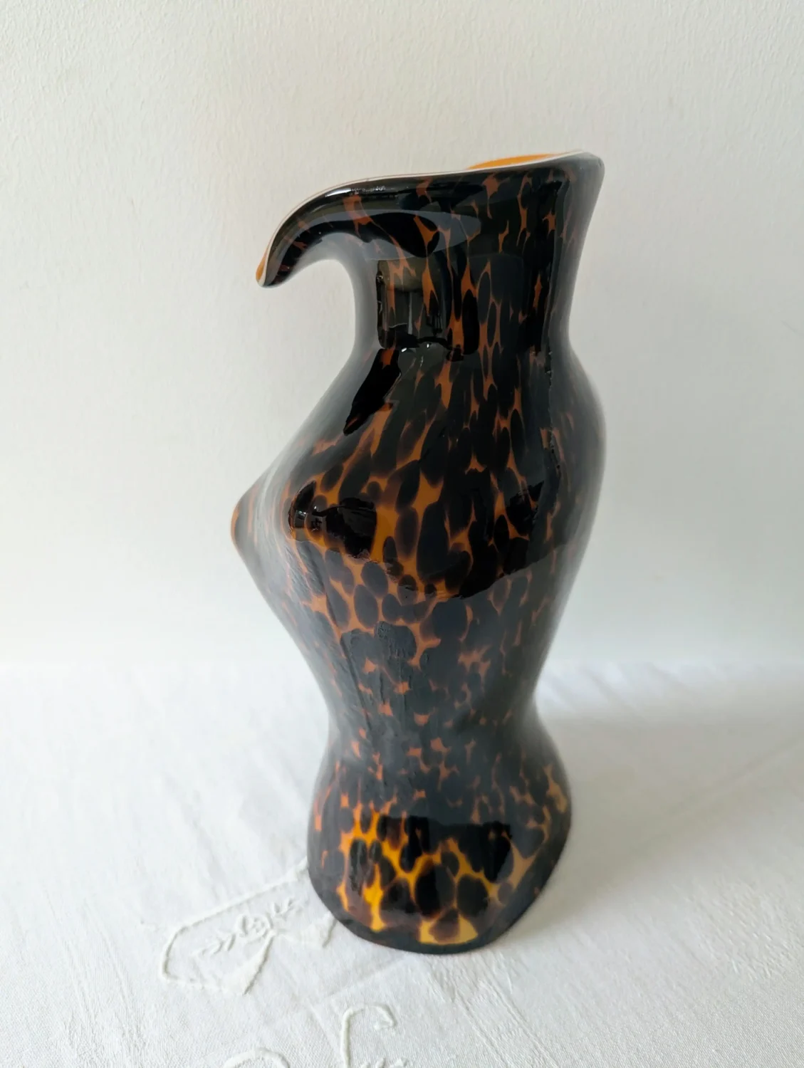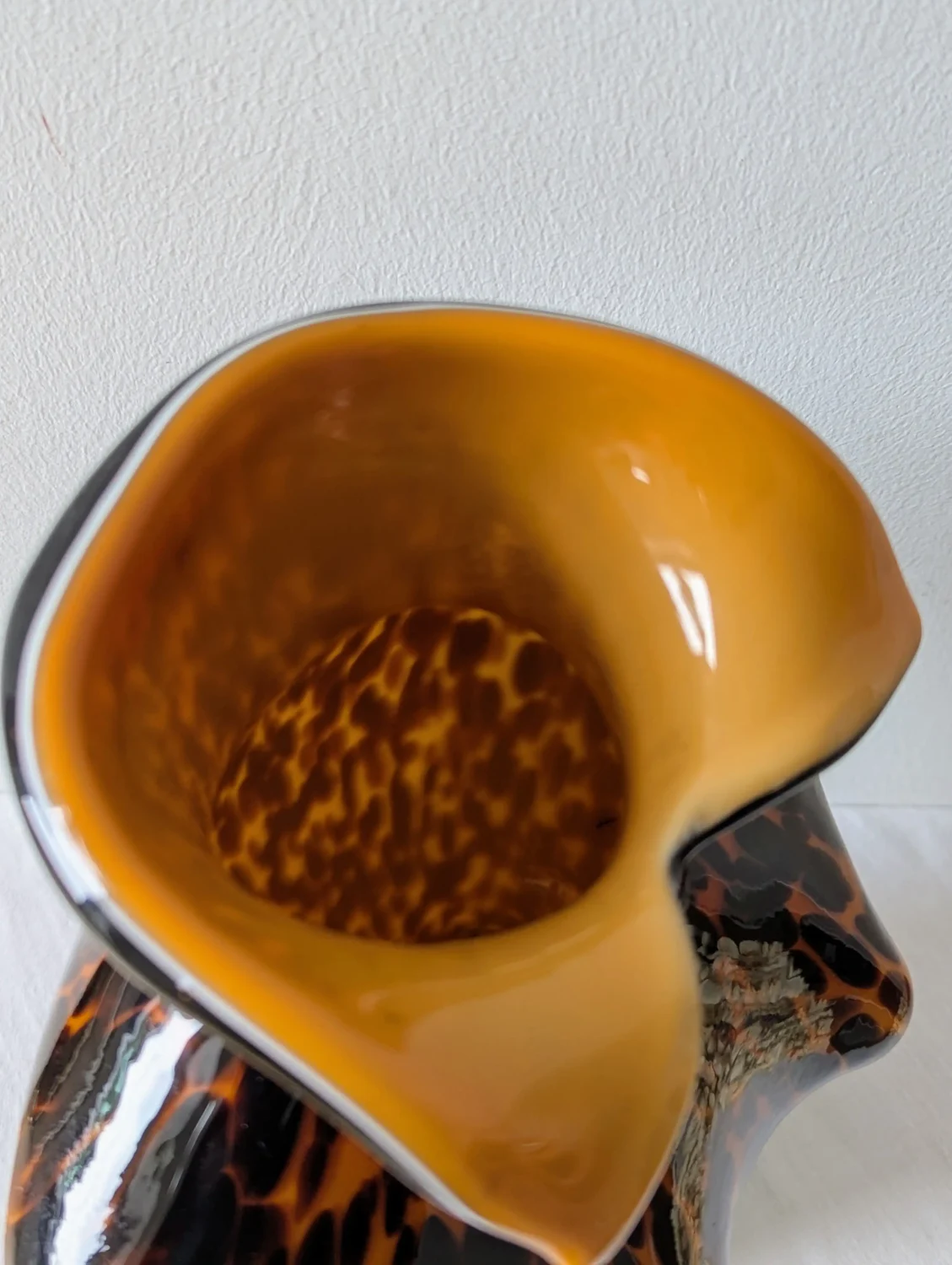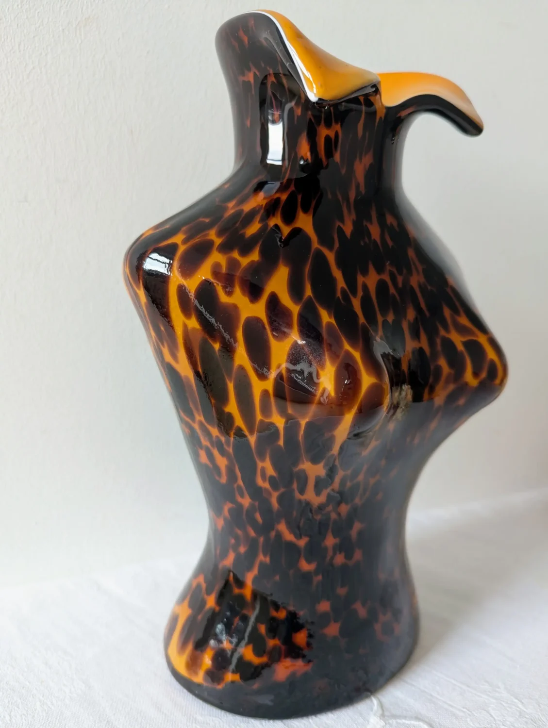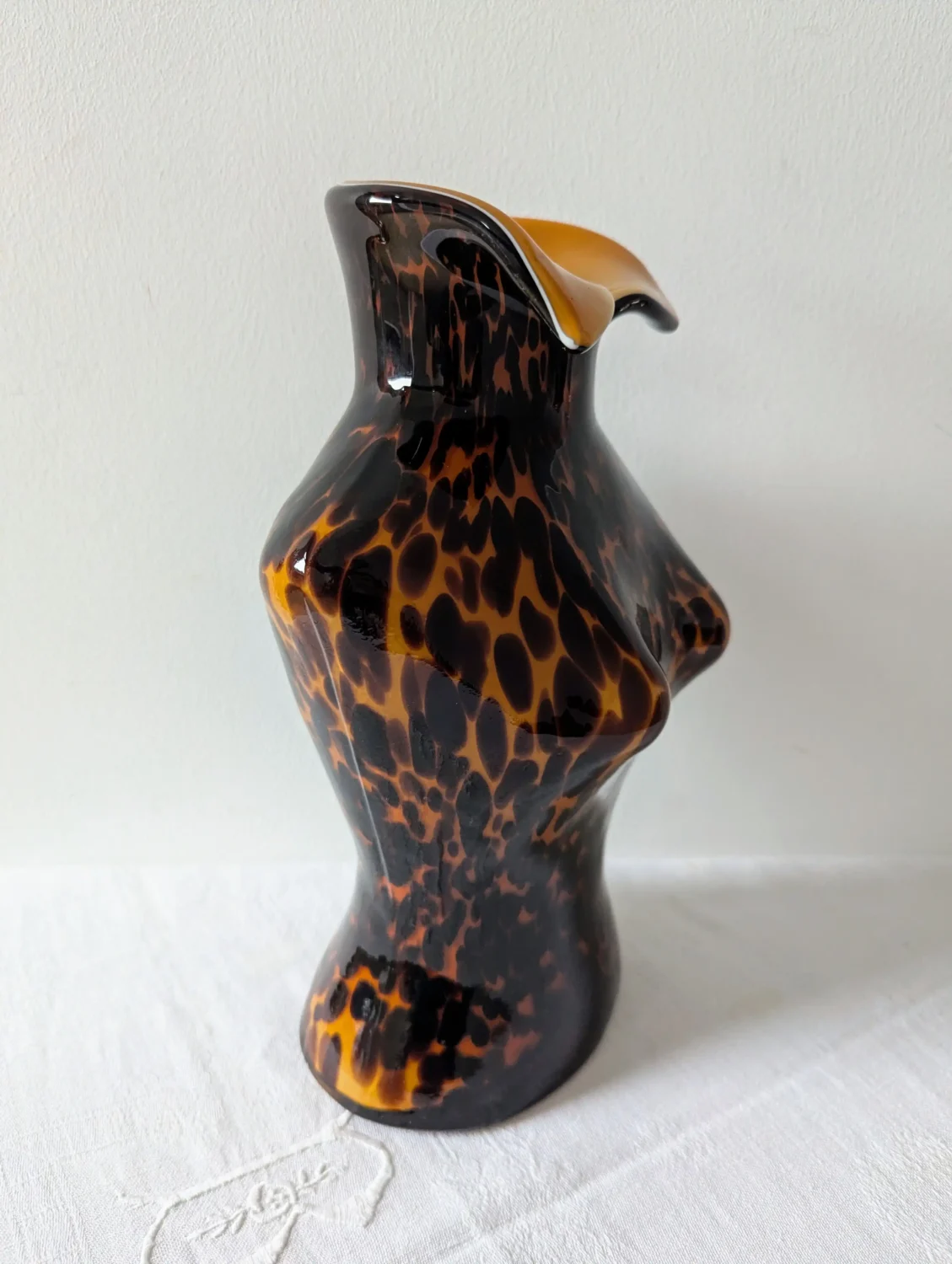 Ce vase sculptural style Murano attire le regard par sa silhouette organique et son motif léopard d’un brun profond mêlé d’éclats ambrés. Entièrement réalisé en verre moulé, il présente des lignes libres et sensuelles, évoquant un buste féminin stylisé. Sa texture brillante et son dégradé chaleureux en font une pièce déco forte, à la fois moderne et vintage.