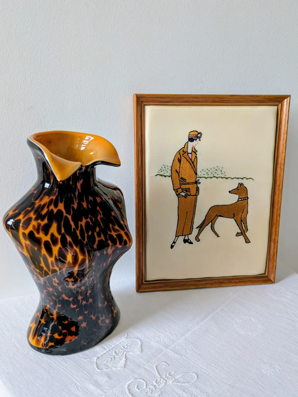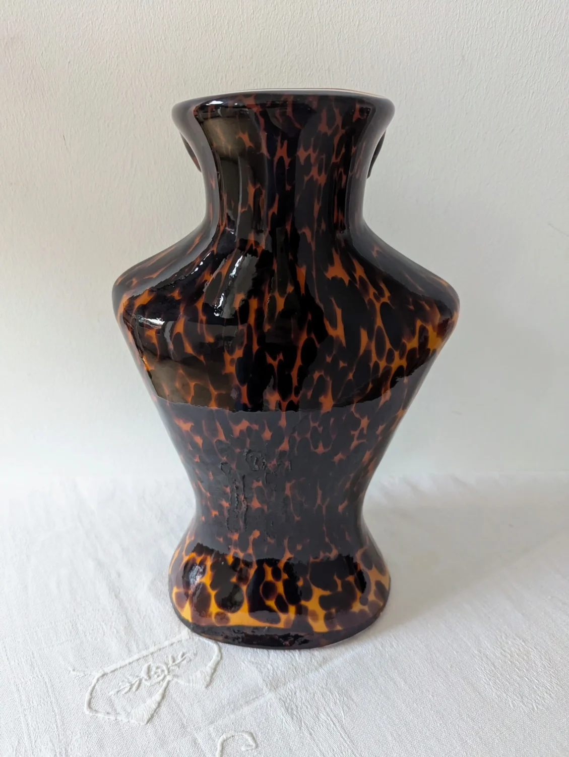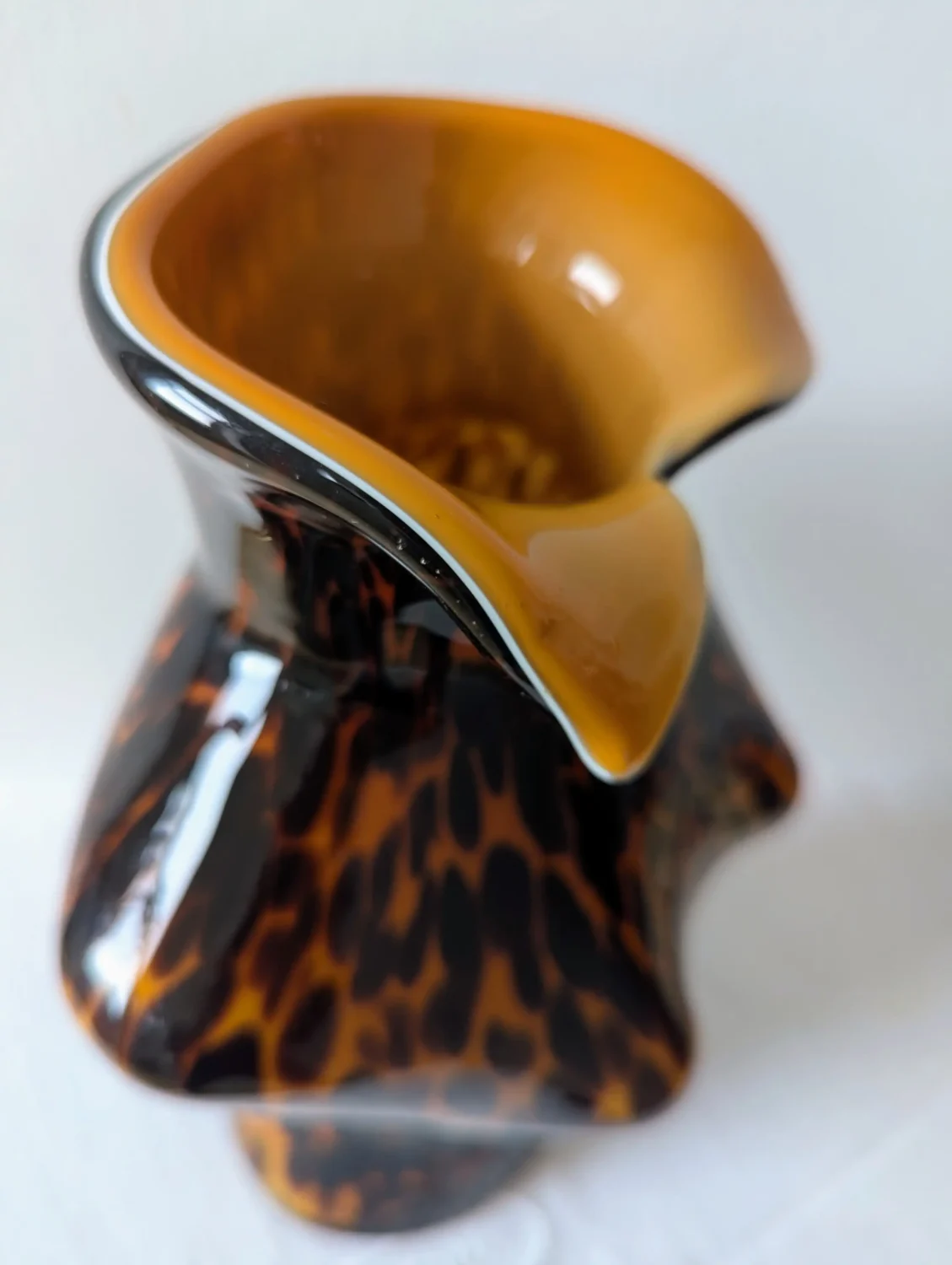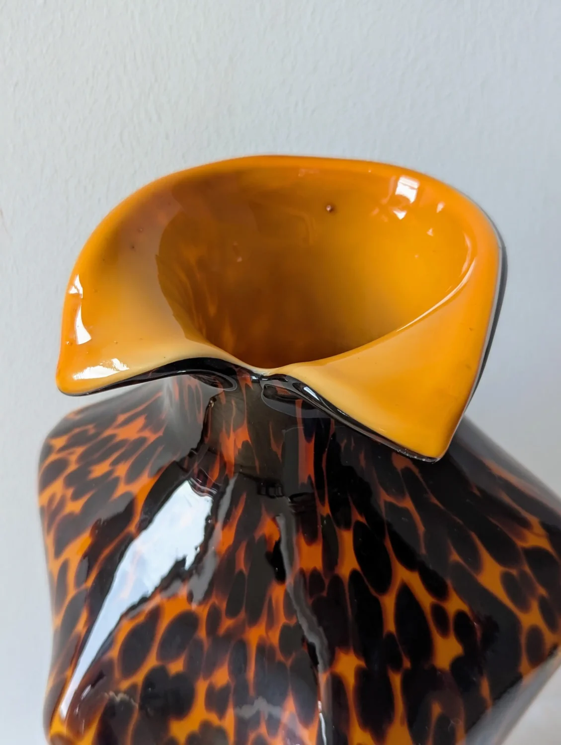 Ce vase sculptural style Murano attire le regard par sa silhouette organique et son motif léopard d’un brun profond mêlé d’éclats ambrés. Entièrement réalisé en verre moulé, il présente des lignes libres et sensuelles, évoquant un buste féminin stylisé. Sa texture brillante et son dégradé chaleureux en font une pièce déco forte, à la fois moderne et vintage.