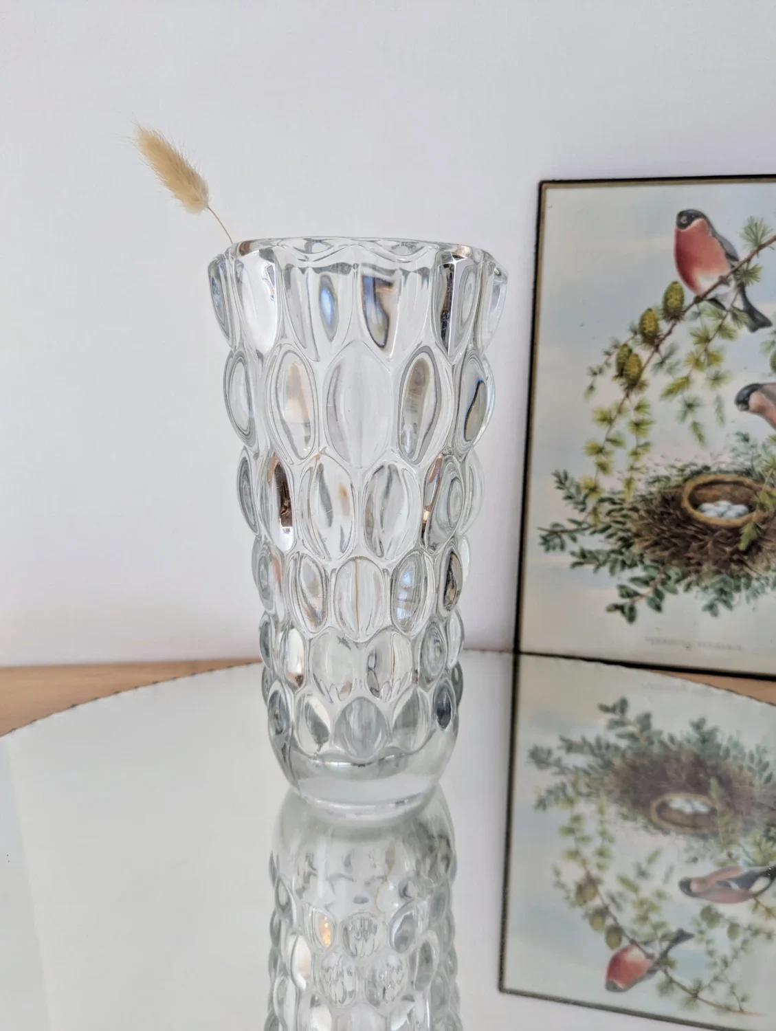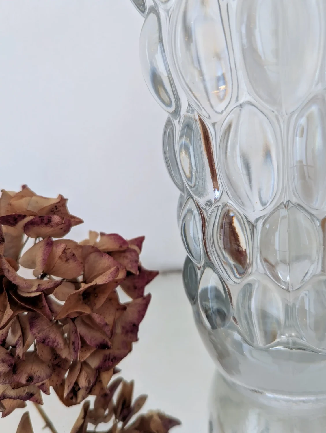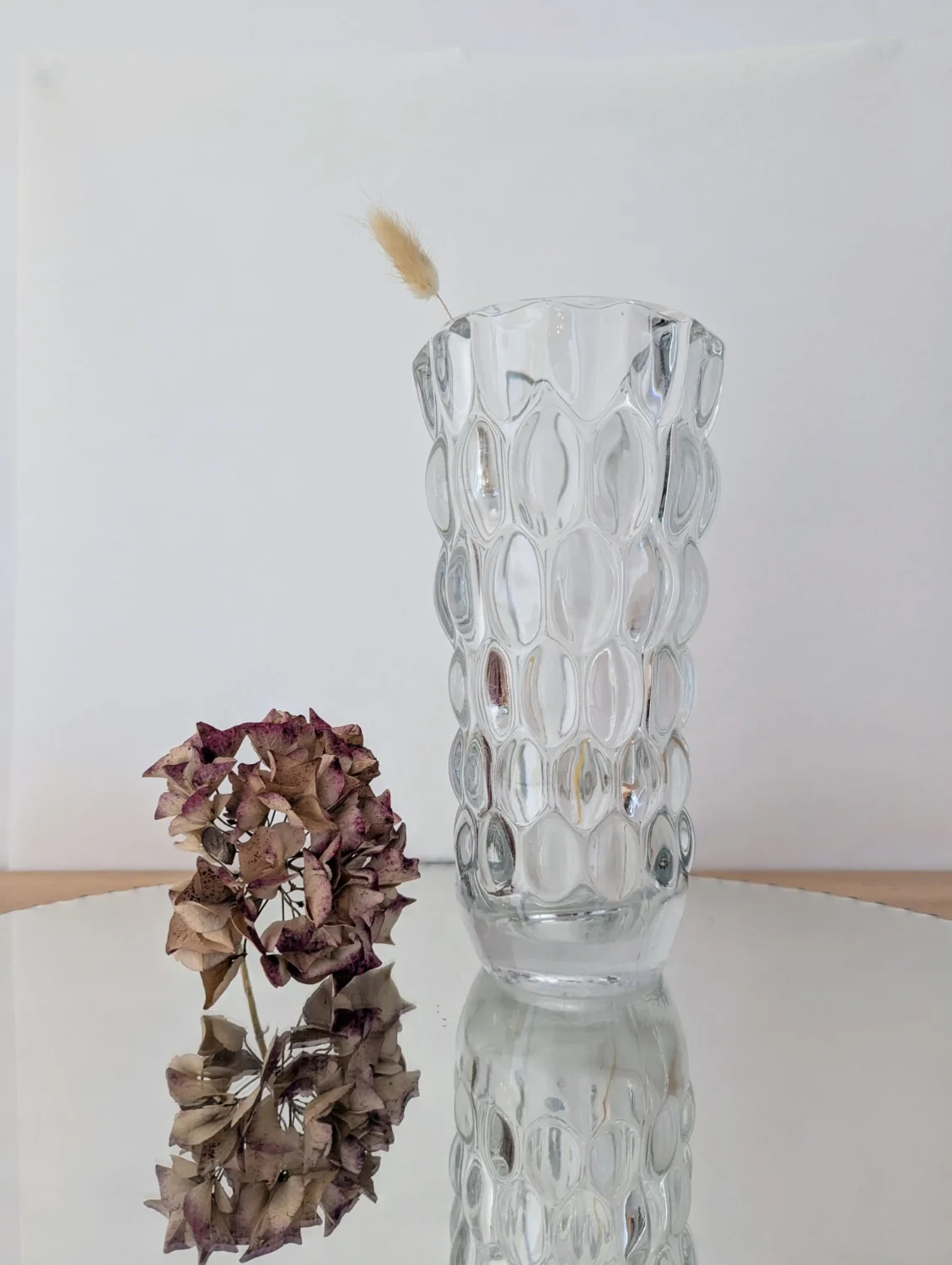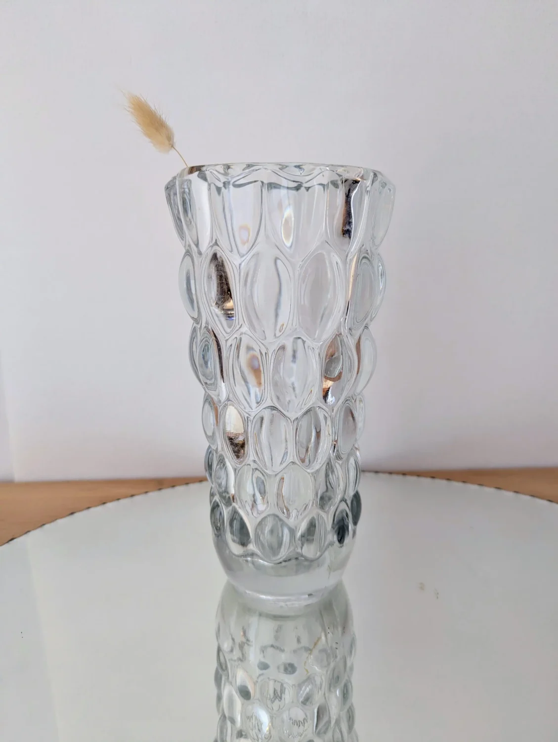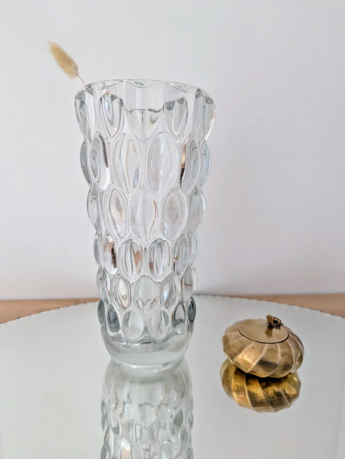 Le vase pour Sklo Union présente des rangées verticales de bulles en relief, harmonieusement disposées sur toute la surface. Ces motifs ajoutent du volume, de la lumière et du mouvement à la pièce. Il mesure 25 cm de hauteur, une taille parfaite pour accueillir un bouquet généreux ou simplement orner un meuble avec style.
