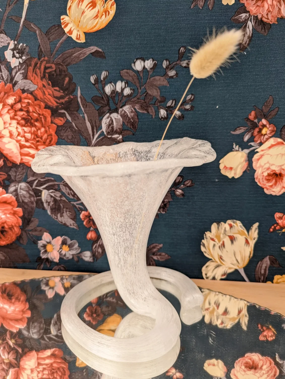 Ce vase trompette Murano vintage attire immédiatement le regard grâce à son verre soufflé lumineux, sa couleur blanche éclatante et sa silhouette élégante. Dès que l’on l’observe, on comprend qu’il s’agit d’une pièce artisanale unique. En effet, sa texture, ses bulles d’air et sa forme corolle révèlent une fabrication traditionnelle réalisée selon les techniques ancestrales de l’île de Murano en Italie. Sa présence décore naturellement un intérieur, tout en apportant une note de poésie et de caractère.