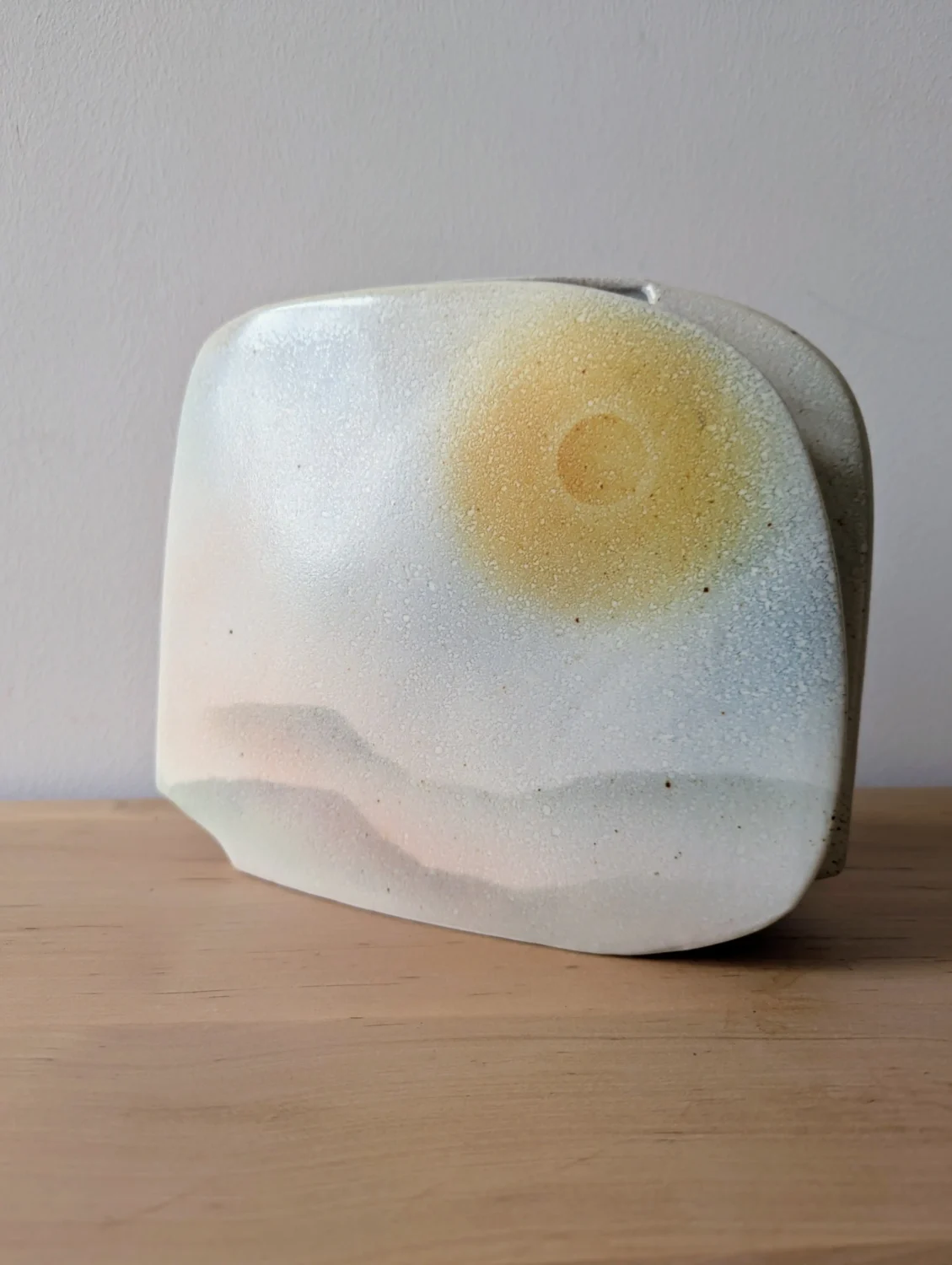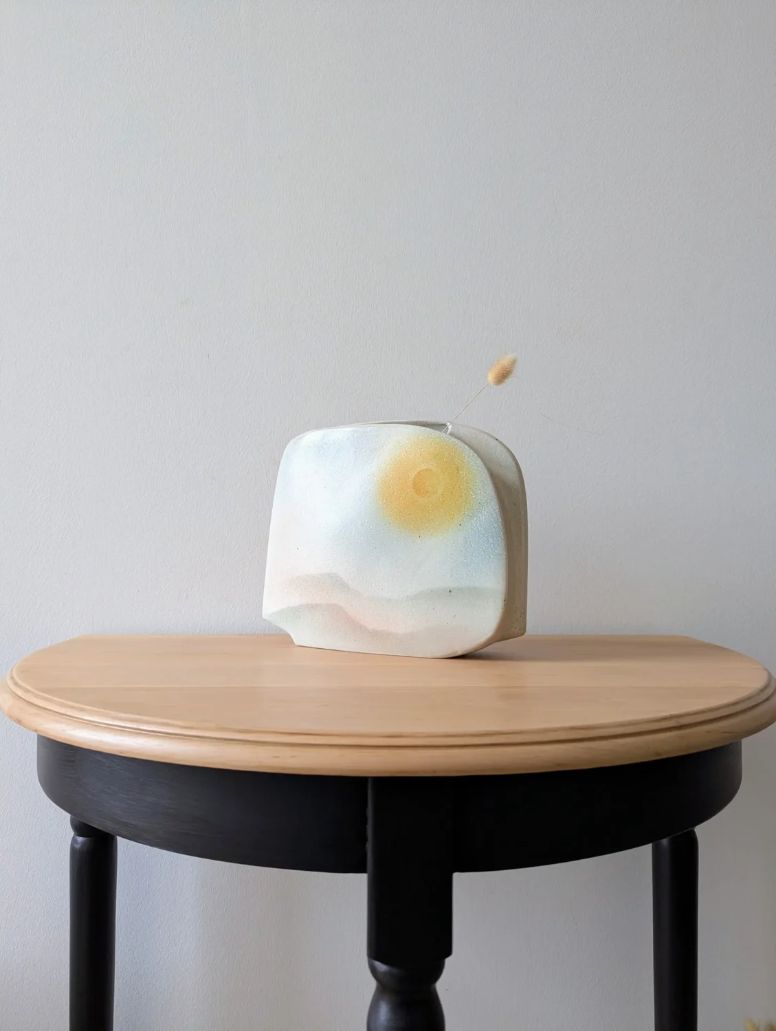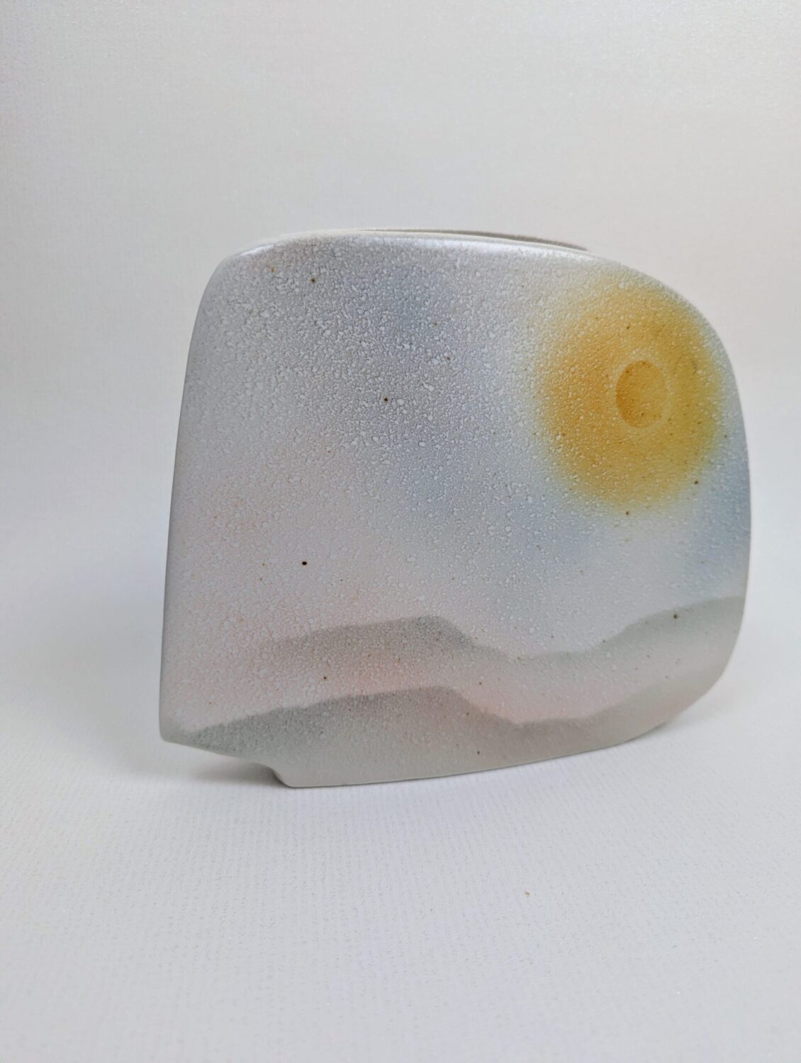 Par ailleurs, le décor peint, situé entre abstraction et paysage stylisé, confère à cette pièce une dimension artistique singulière, presque poétique, qui enrichit chaque intérieur avec finesse. Ce vase n’est donc pas simplement un récipient, mais bien une véritable œuvre sculpturale, pensée pour émerveiller et surprendre.