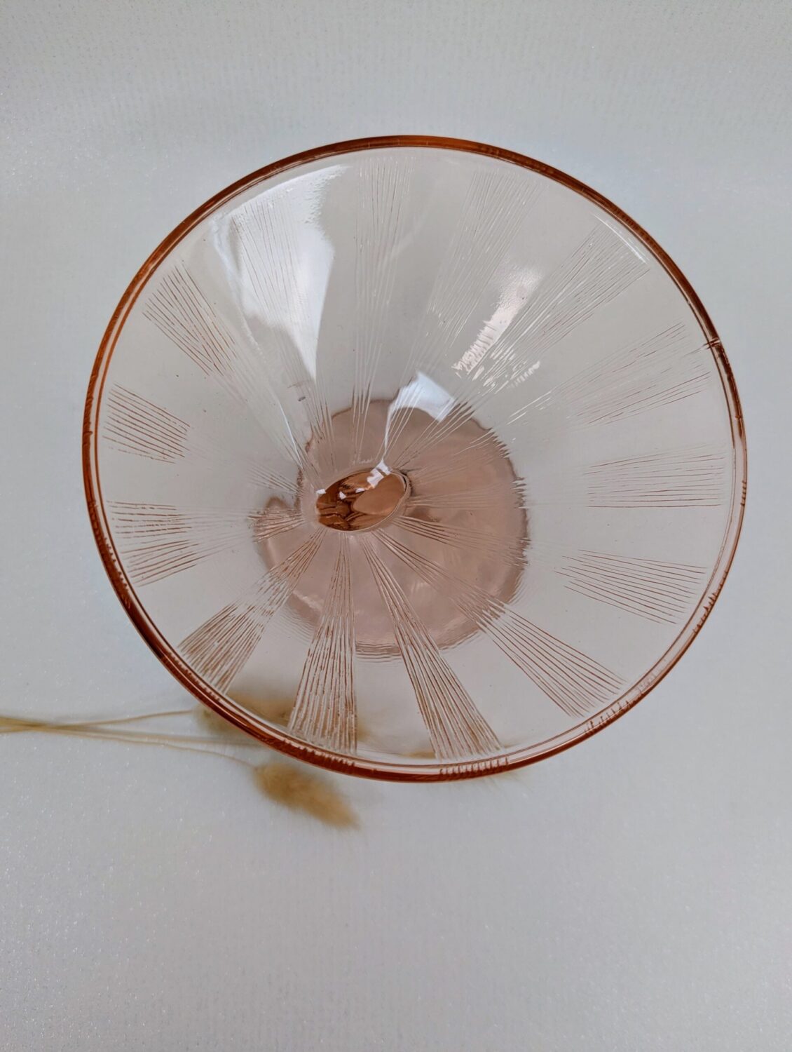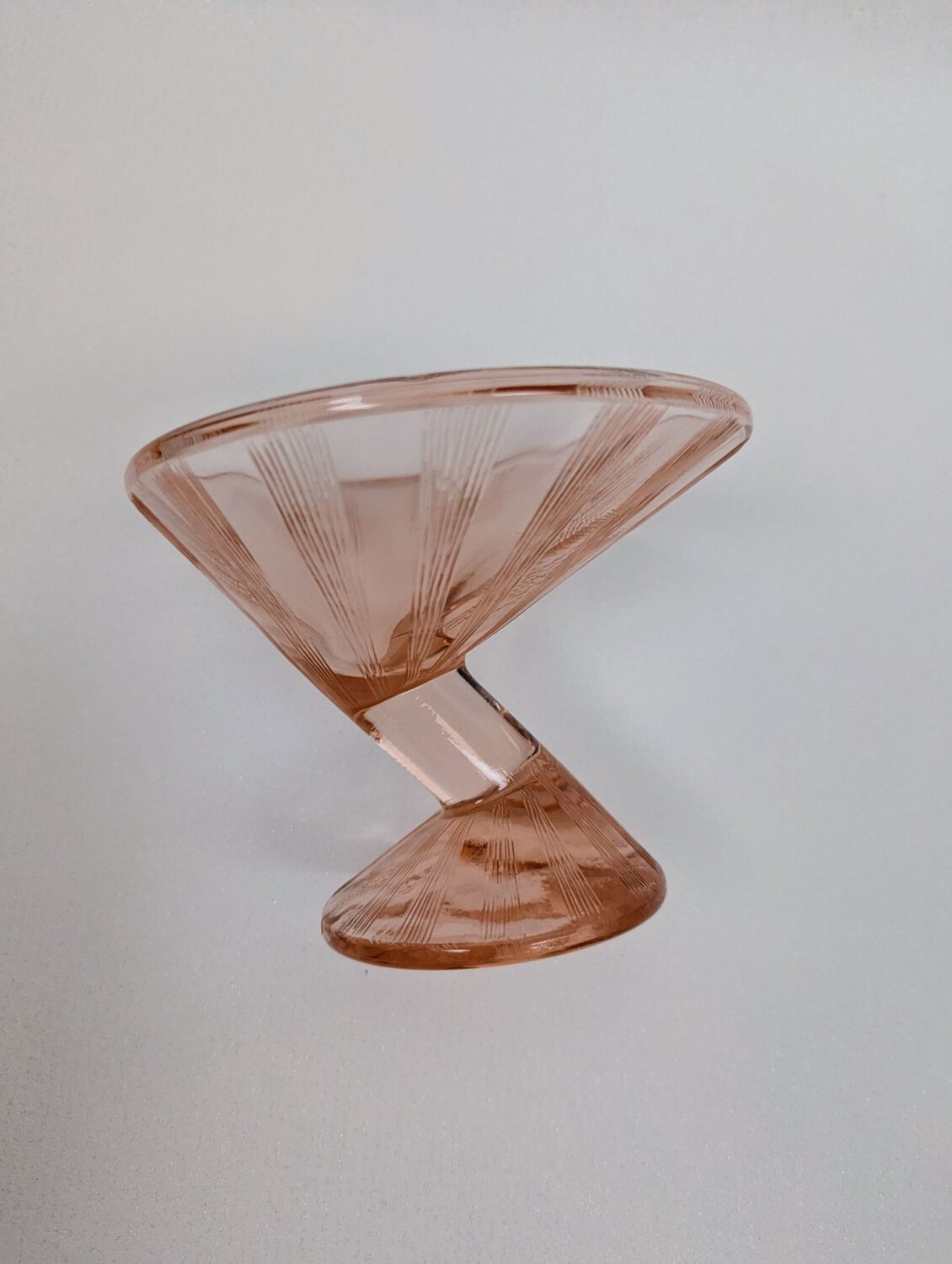 Ce verre à martini Art Deco séduit par sa forme emblématique sur pied, et surtout sa teinte rosée subtile qui capte délicatement la lumière. À la croisée entre objet utilitaire et œuvre décorative, il incarne le raffinement et le sens du détail propres aux créations des années 1920.